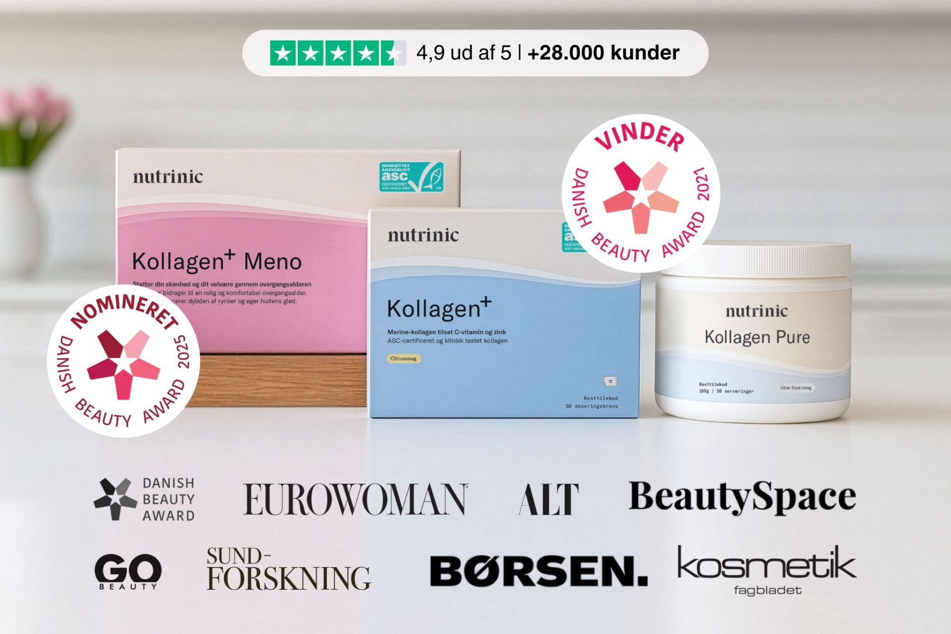 Med priser som Danish Beauty Award og topplaceringer i tests tilbyder Nutrinic en serie produkter, der er skabt til at opfylde alle dine behov for kollagentilskud. Uanset om du søger et all-round produkt, et rent tilskud til kaffen, eller noget målrettet overgangsalderen, finder du det hos Nutrinic.