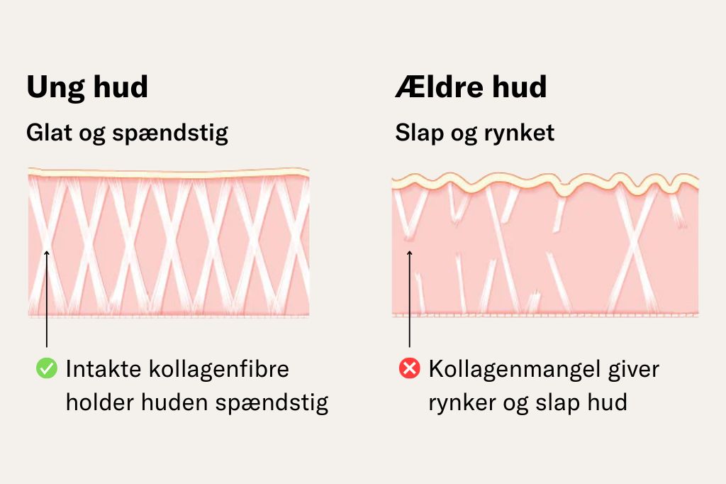 Allerede fra 25-årsalderen falder kroppens naturlige kollagenproduktion med 1–2% om året, og denne process bliver fremskyndet med alderen. Med tiden falder produktionen så meget, at huden ikke længere kan holde huden ligeså stram og spændstig, som tidligere. Heldigvis er det muligt for kroppen at optage kollagen udefra gennem fordøjelsessystemet. Enten fra kollagenrige fødevare eller via et tilskud.