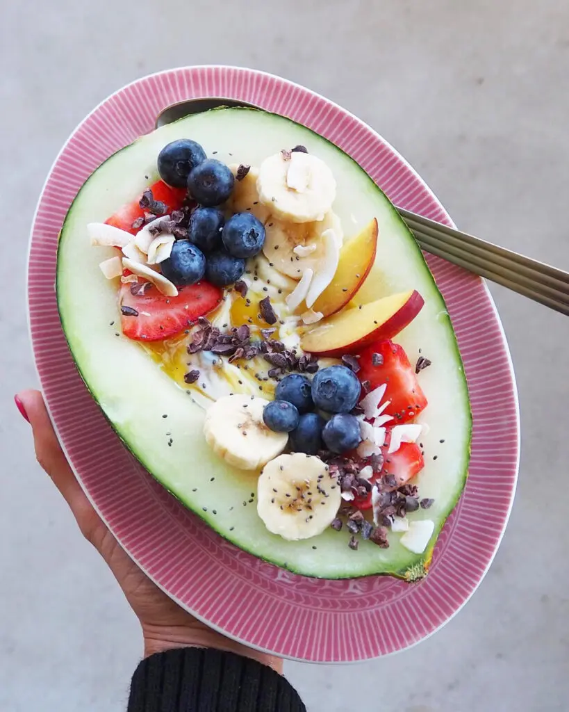 Tip: Du kan variere fyldet som du har lyst – hvis du skal servere melonen som en sommerdessert kan du fylde den med vanilleis/sorbet, men skal den spises til morgenmad er det lækkert med skyr eller yoghurt.