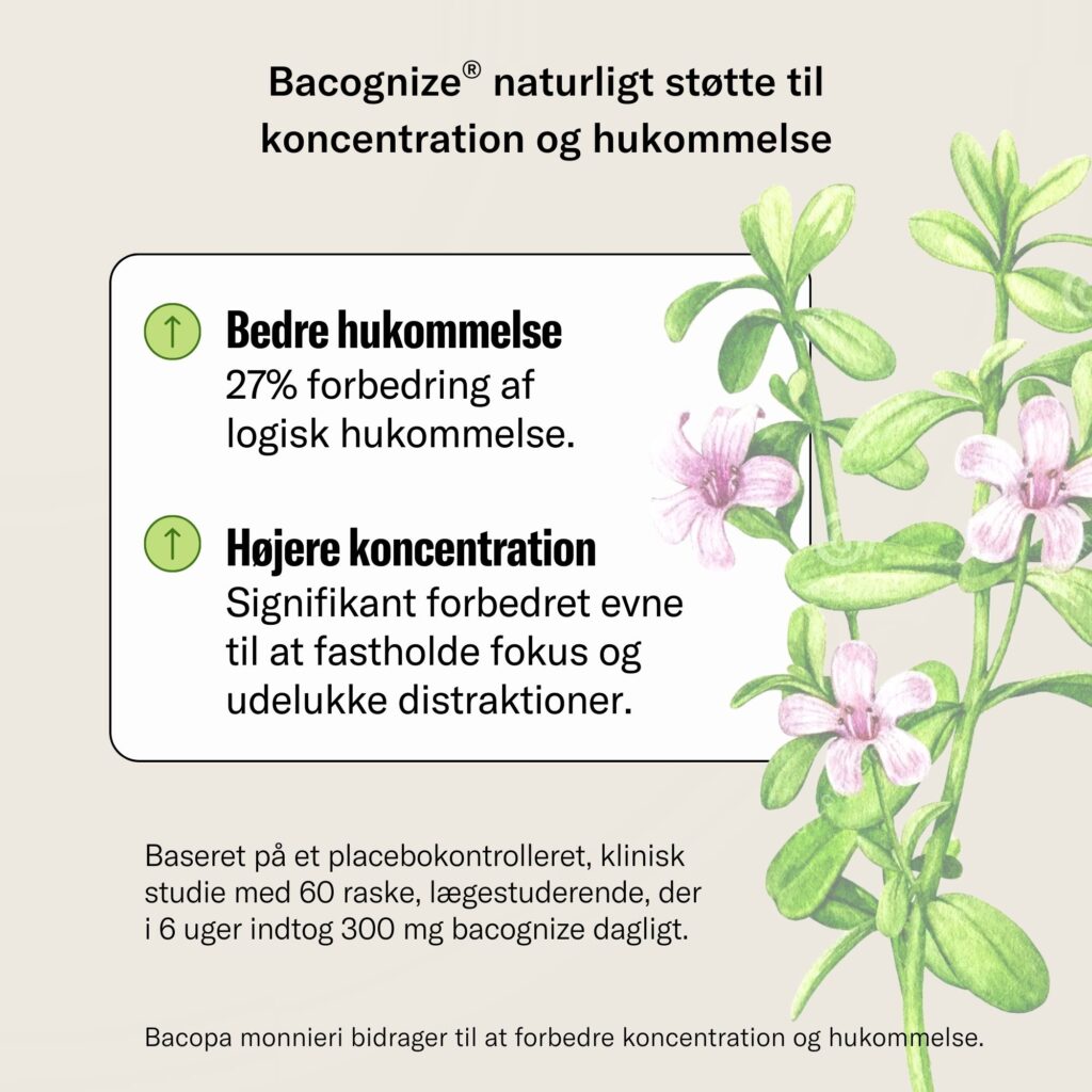 Hovedingrediensen i Fokus er Bacognize®. Et varemærkebeskyttet og standardiseret planteekstrat. I kliniske test har Bacognize® vist signifikante forbedring i hukommelse og koncentration.