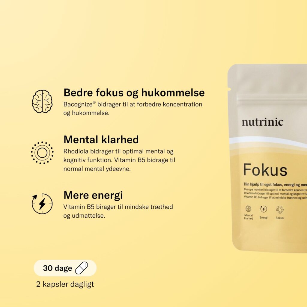 Fokus er formuleret med en blanding af naturlige planteekstrakter og næringsstoffer, der støtter din hjernes evne til at holde fokus og øge dit mentale overskud i hverdagen.