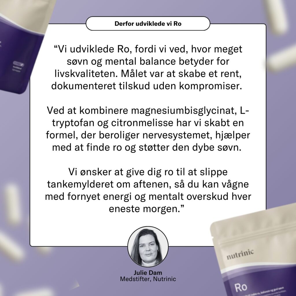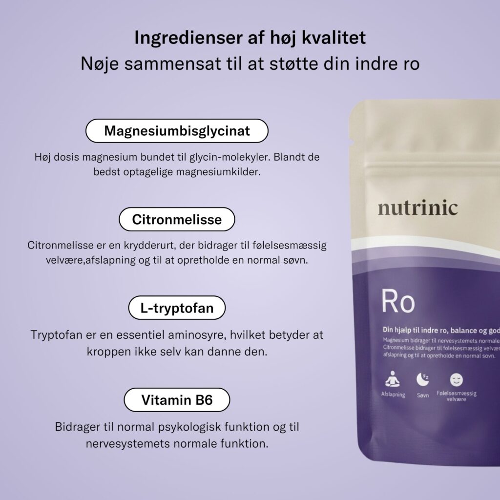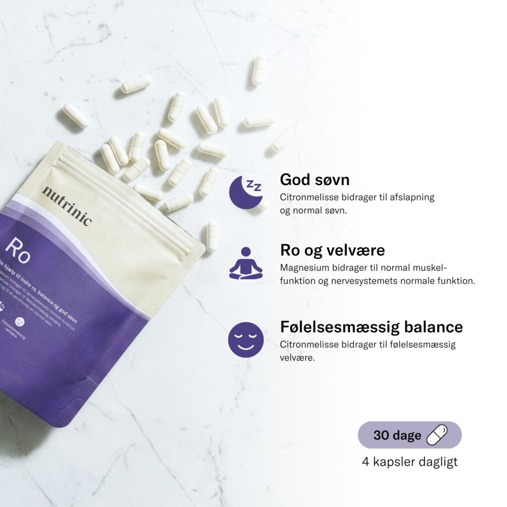 Ro er formuleret med en blanding af højoptageligt magnesiumbisglycinat, naturlige planteekstrakter og næringsstoffer, der til sammen hjælper dig med finde ro, balance og sove godt.